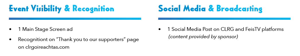 Provides broader visibility with a main stage screen ad and social media recognition during the event.